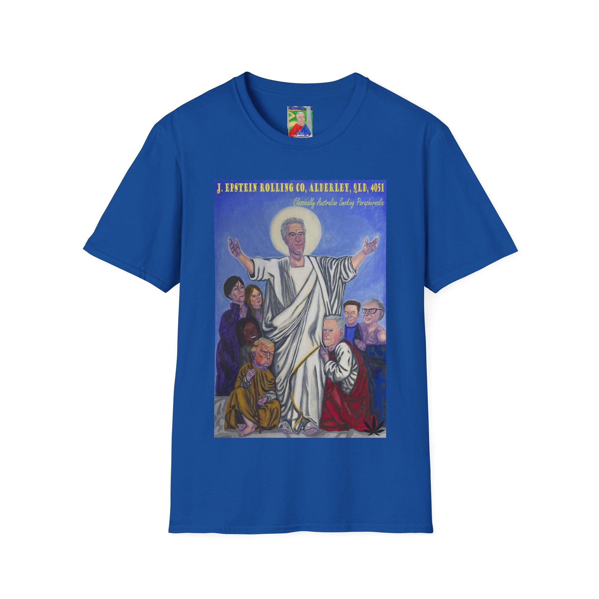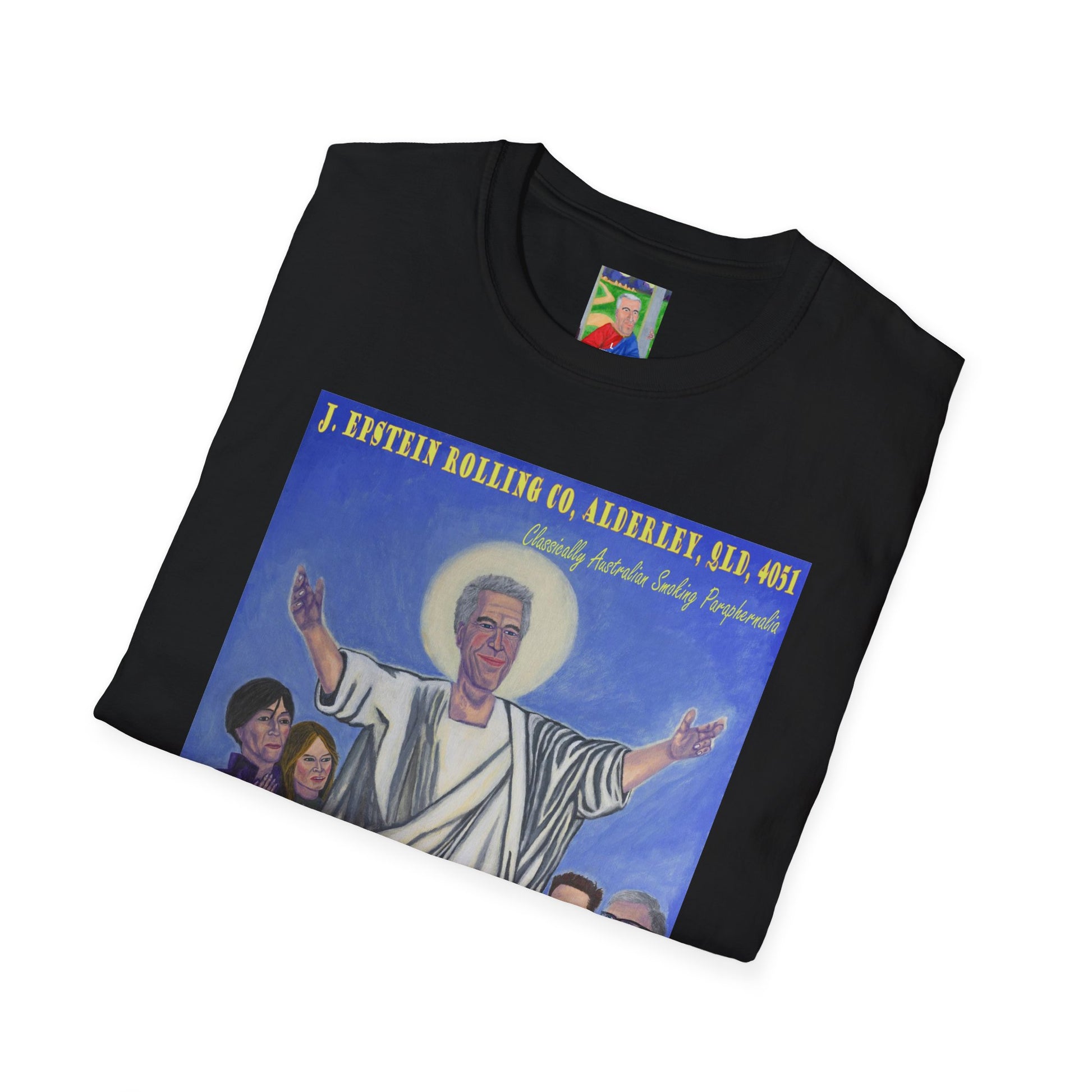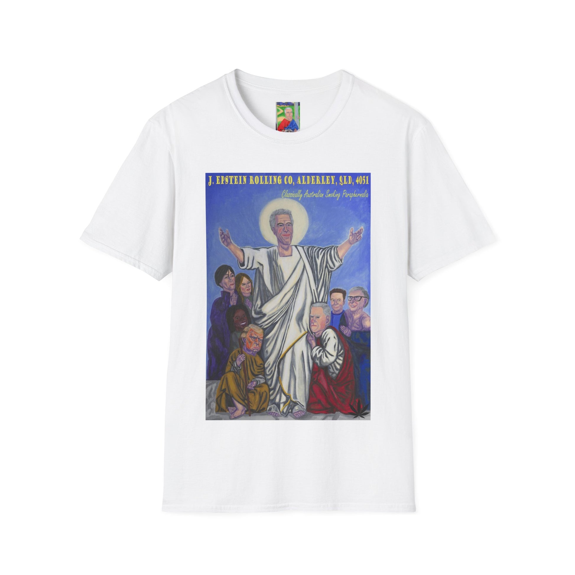 A unique unisex softstyle t-shirt featuring a hand-painted design of Jeffrey Epstein with a touch of dark humor and Jesus references. This t-shirt exudes a controversial and edgy vibe, perfect for those with a taste for dark humor and satire. Ideal for casual wear and makes a bold statement for those who appreciate unconventional art and humor. Relevant for those who enjoy controversial topics and want to make a statement with their clothing. Perfect for wearing on occasions where a bold and unique style is appreciated.